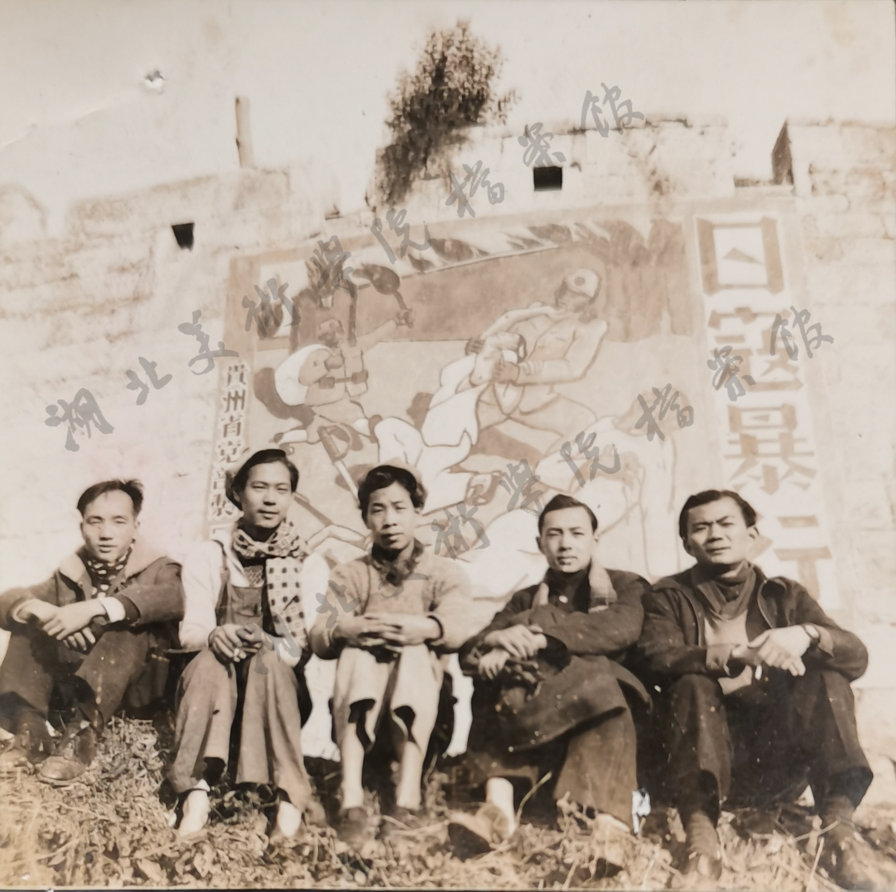 1938年因抗日战争形势严峻,杭州国立艺专向西南迁徙,路经贵州,张祖武(左一)与同学在城墙画抗日宣传壁画