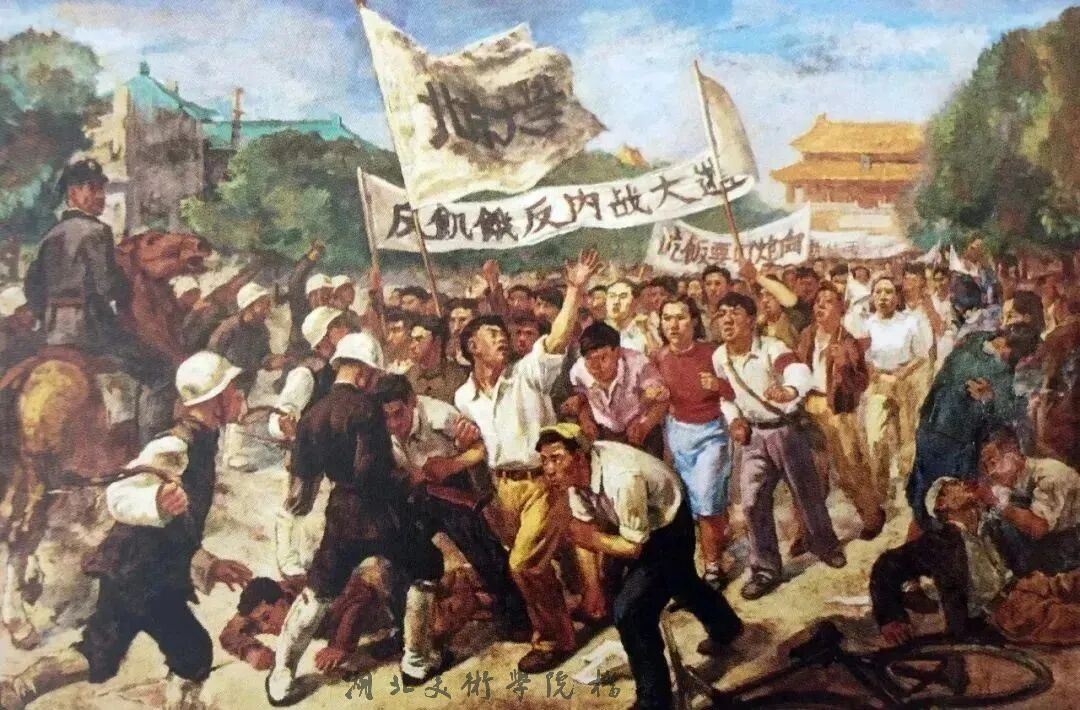 冯法祀在首届国展中展出素描作品《喝水》《铁工厂》 以及油画作品《反扶日大游行》(也称为《反饥饿反内战大游行》)。