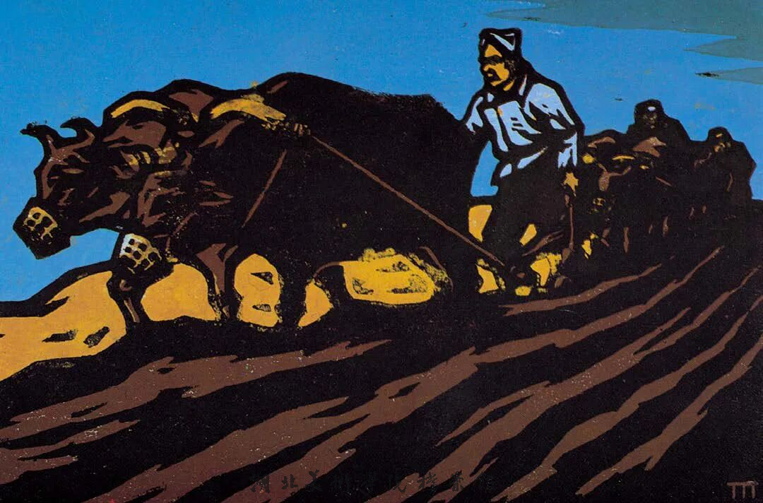 胡一川 《牛犋变工队》 套色木刻 1944年作于延安