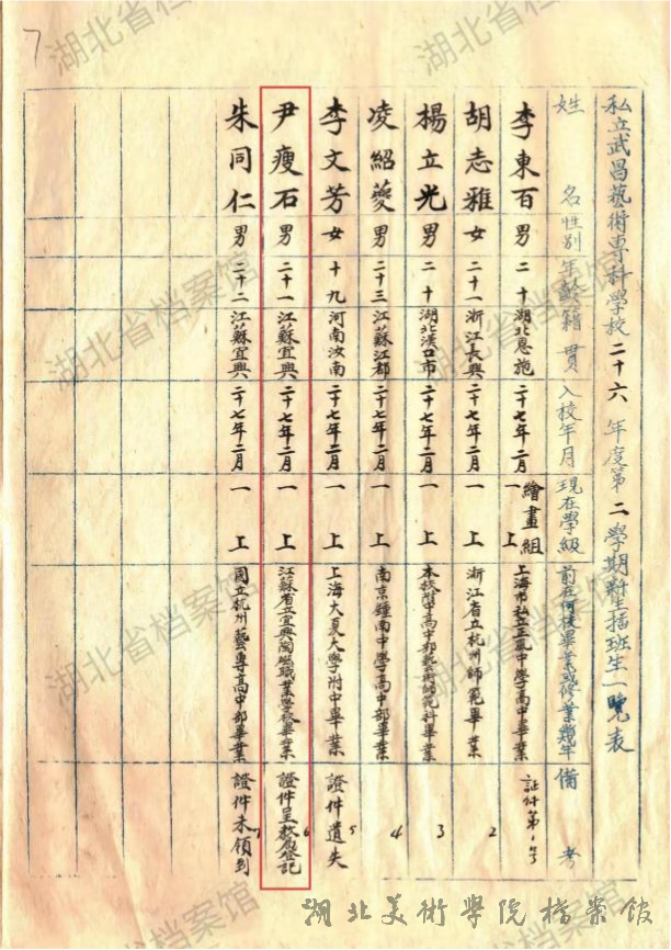尹瘦石 江苏宜兴人 二十七年二月(1938年2月)入校绘画组一上