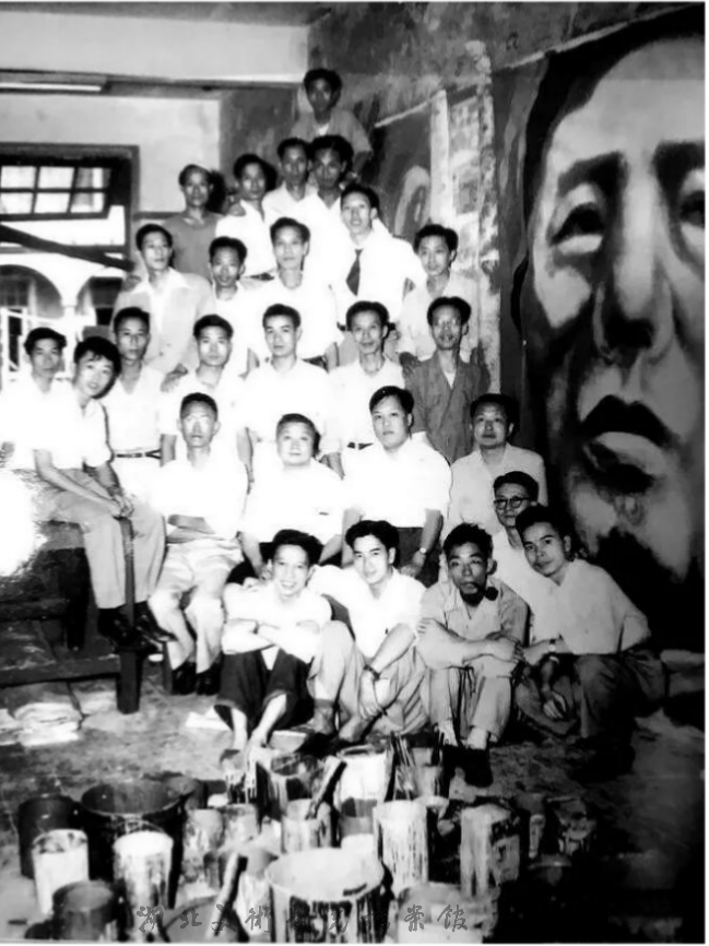 1949年,杨太扬(阳太阳)(四排右3)与王琦(四排右2)、杨秋人(三排右2)、关山月(一排右1)等“人间画会”成员在香港绘制《中国人民站起来了》